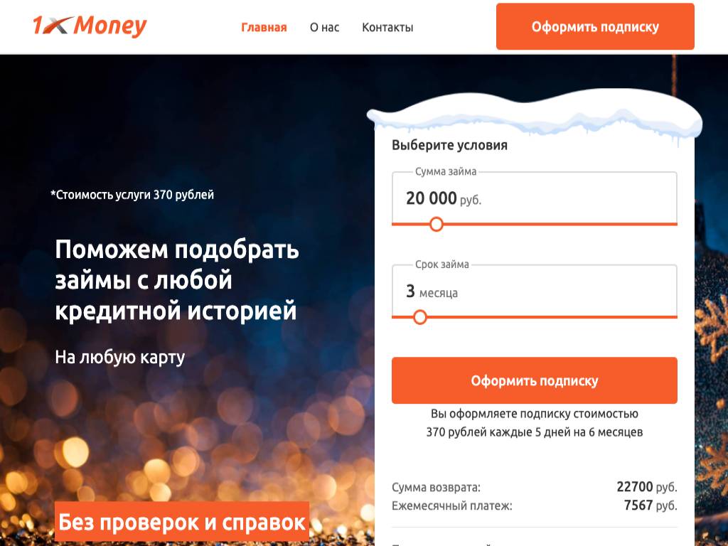 1XMoney — сервис по подбору кредитных продуктов на сумму от 5 000 до 100 000 рублей. Срок пользования варьируется от 61 дня до года. Максимальная процентная ставка — 0,98% в день. За каждые 5 день работы с сервисом взимается оплата в размере от 49 до 499 рублей. Подписку можно отменить в любой момент. Для подачи заявки нужно предоставить паспортные данные и указать номер телефона. Обратная связь: по телефону и электронной почте.