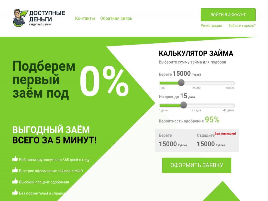 Доступные деньги — онлайн-сервис по подбору кредитов. Плата за использование — 299 рублей в месяц. Пользователи, оформившие подписку, получают возможность отправлять анкеты сразу в несколько микрокредитных организаций. Им приходят смс-уведомления о выгодных акциях и предварительно одобренных заявках. Можно проверить кредитный рейтинг (один раз по запросу). Условия займа зависят от выбранного кредитора. Оплатить подписку можно банковской картой.