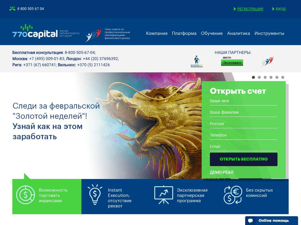 770capital — сервис для проведения операций на фондовых рынках. Пользователи получают доступ к торговле акциями, драгоценными металлами и разнообразными валютами. Работать можно везде, где есть интернет. Система подходит для компьютеров разной производительности и не требует скачивания и установки. На сайте регулярно публикуются прогнозы и аналитические материалы. Действует бесплатная телефонная линия техподдержки из любого региона РФ.