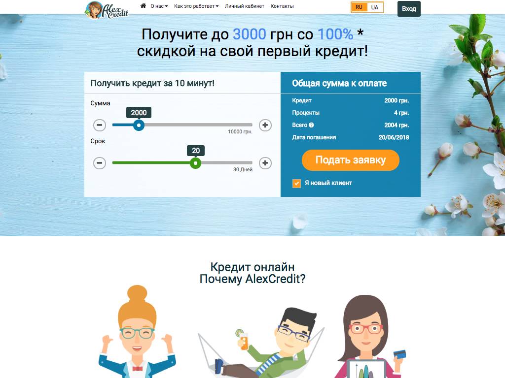 AlexCredit — украинская кредитная фирма, принимающая заявки на займы через интернет. Суммы от 3 тысяч до 10 тысяч гривен выдают только добросовестным плательщикам со стажем. На возврат денег выделяется от 5 до 30 дней. Оплатить заем можно любой картой на сайте, а также через системы IBox, EasyPay и некоторыми другими способами. На первый кредит (до 3 тысяч гривен) можно получить 100% скидку. Ставка на следующие займы составляет 620.5% годовых. Сайт функционирует на двух языках: русском и украинском.