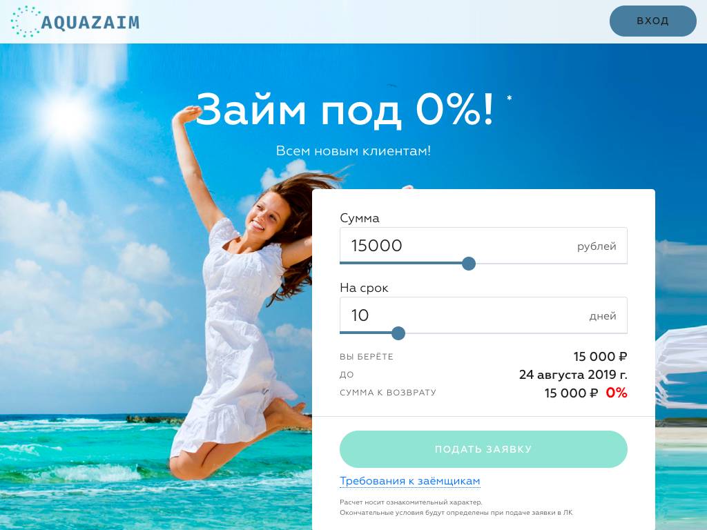 Aquazaim — круглосуточный сервис подбора микрокредитов до 30 тысяч рублей. Максимальный срок — 30 дней. Новые клиенты могут получить беспроцентный займ. Деньги переводят на банковские карты, на счета Яндекс. Деньги или QIWI. Подробные условия кредитования можно узнать в личном кабинете. Чтобы получить доступ к аккаунту, необходимо пройти регистрацию с указанием паспортных данных. Предоставляются услуги по улучшению кредитной истории. Работает служба поддержки.