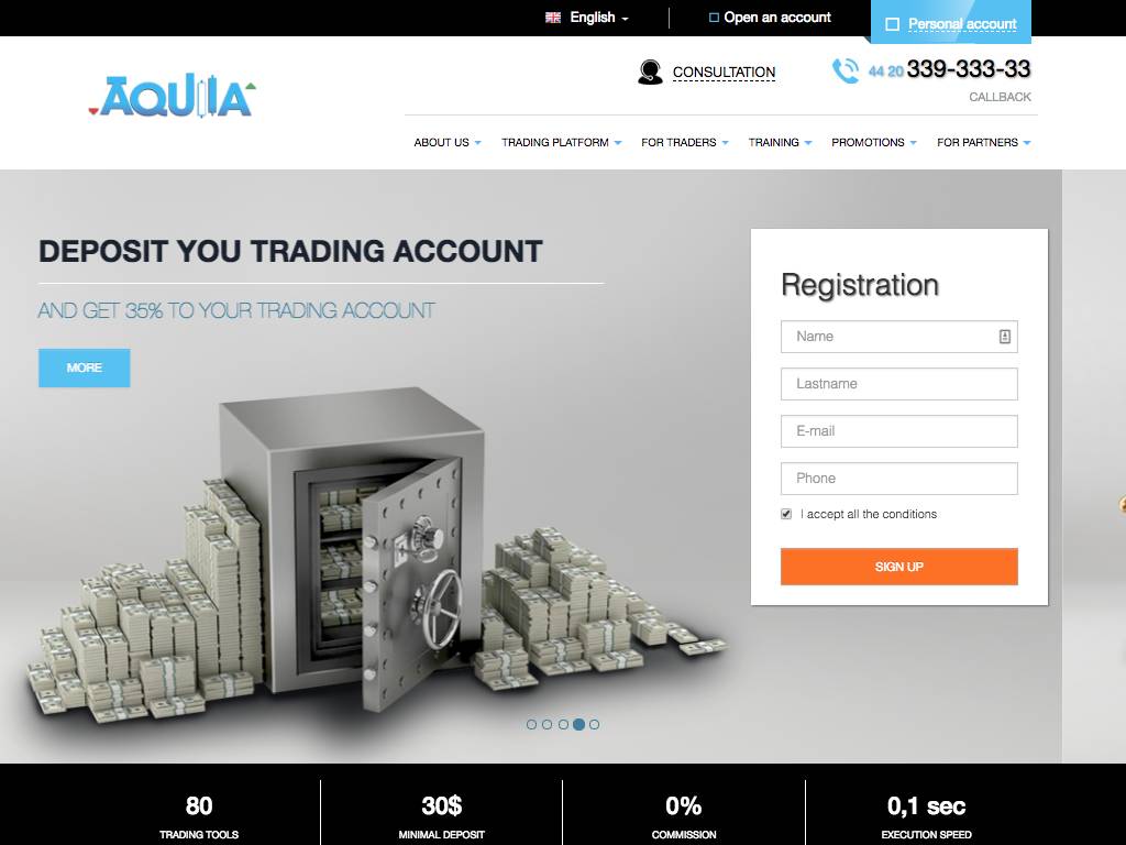 Aqulla — компания, дающая возможность ведения трейдерских операций. Ее сайт открывает доступ к торговой платформе и позволяет завести счет. Новички могут обучиться здесь основам биржевой торговли, а опытные трейдеры — пройти повышение квалификации. Портал работает на английском и русском языках. Средства зачисляют и выводят в долларах через платежные системы VISA и MasterCard. Размер минимального депозита и суммы для вывода составляет 30 долларов.