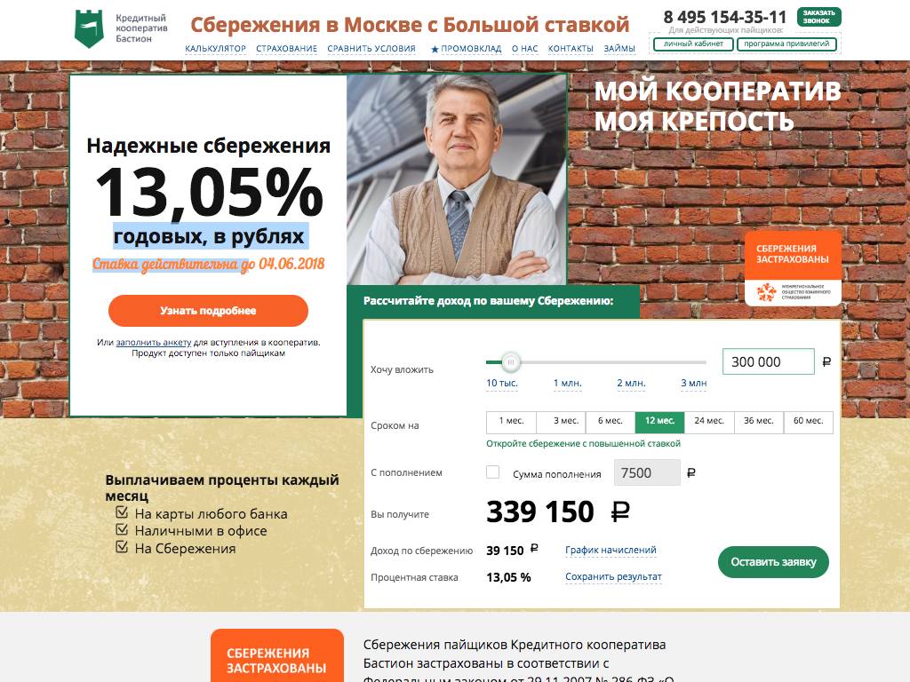 Бастион — кредитный кооператив. Он дает возможность открыть вклад с доходностью 13,5% годовых на срок от 1 до 60 месяцев. Проценты переводят на карту или выдают наличными. Можно завести на сайте кооператива личный кабинет и оттуда в удобное время управлять своими счетами. Руководство компании уверяет: все сбережения клиентов застрахованы. У фирмы есть офис в Москве. Она работает также и в сфере кредитования, оформляя своим пайщикам займы на разные сроки. Пакет документов при этом требуют минимальный.