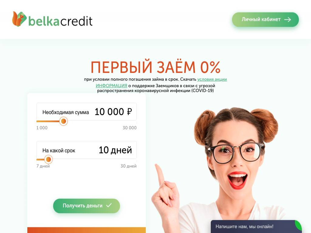 BelkaCredit — сервис по подбору онлайн-займов. Возможно получение до 30 тысяч рублей на срок до месяца при ставке 1% в сутки. Для подачи заявки понадобятся только паспортные данные. Одобренную сумму перечисляют на карту. Оплата задолженности производится с банковских карт. В будущем планируют подключить дополнительные каналы для погашения, например, системы QIWI и Золотая Корона. На сайте функционирует чат-бот. Есть телефон для бесплатных звонков из любых регионов РФ.