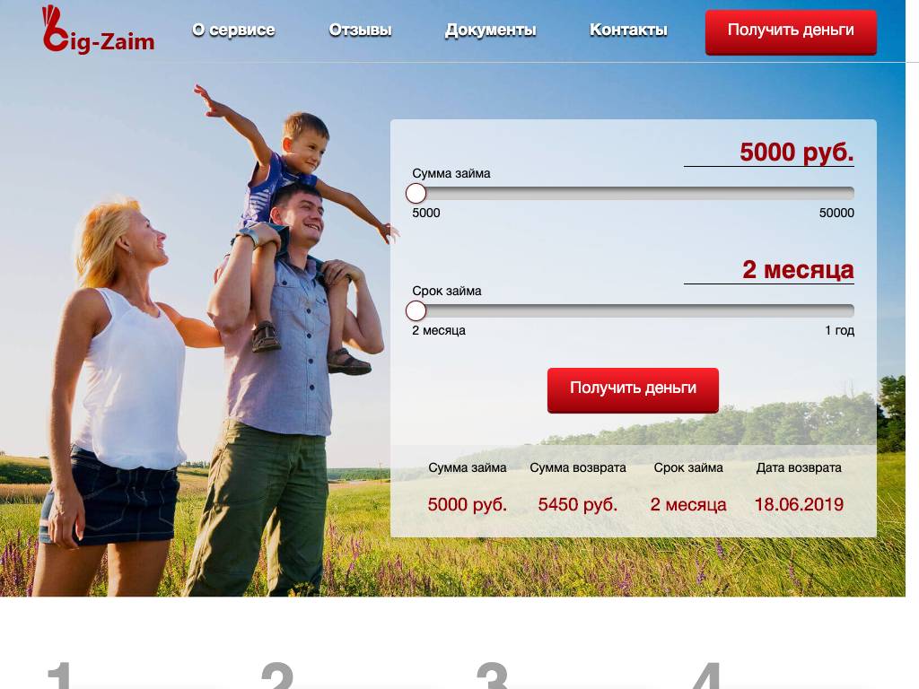 Big-Zaim — онлайн-сервис по подбору займов. Сначала необходимо заполнить анкету и подать заявку на кредит. За обработку последней взимается плата от 49 до 299 рублей. Данные клиента направляют в различные микрокредитные организации. Через портал Big-zaim можно получить от 1 000 до 50 000 рублей на срок от 61 дня до года. Ставка: 0,08−0,98% в день. Средства переводят на банковские карты, а также на счета QIWI, Яндекс. Деньги, через систему «CONTACT» и другими способами.