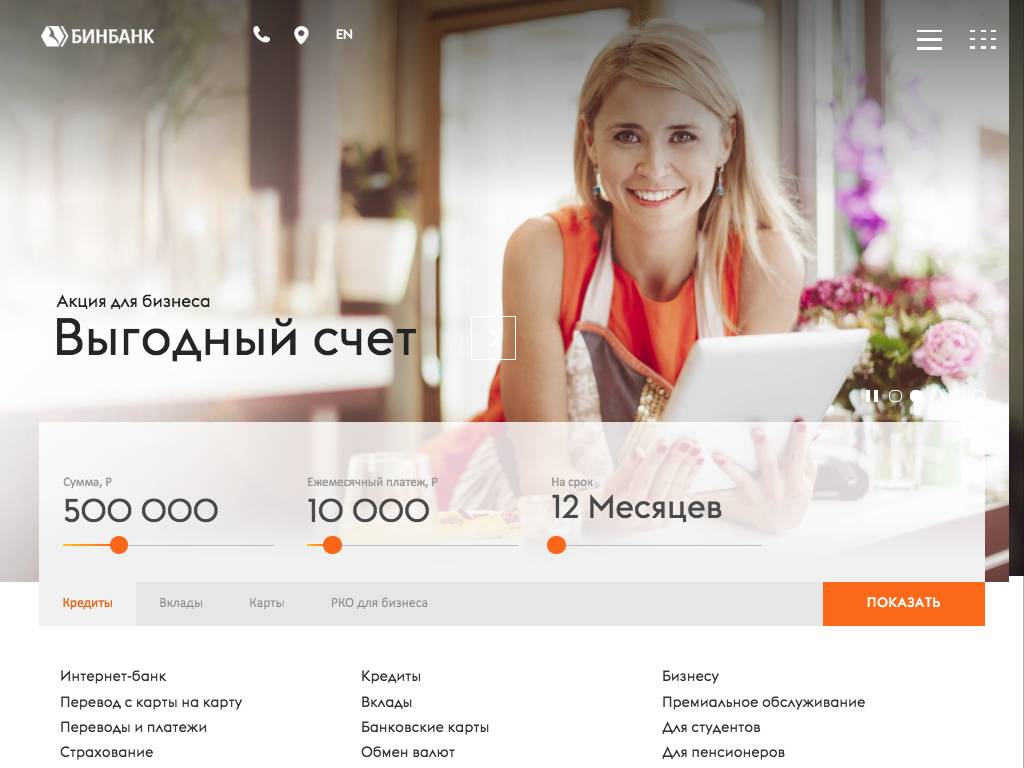 Бинбанк — крупный российский банк, имеющий отделения в более, чем 180 городах России. Предоставляет финансовые услуги как частным лицам, так и представителям бизнеса. На сайте можно получить подробную информацию о продуктах банка, картах, вкладах, кредитовании и страховках. Заполнив короткую форму с контактными данными можно оставить заявку на оформление интересующего вклада или кредита. Для клиентов банка доступен интернет-банк с личным кабинетом, а также мобильный банк.
