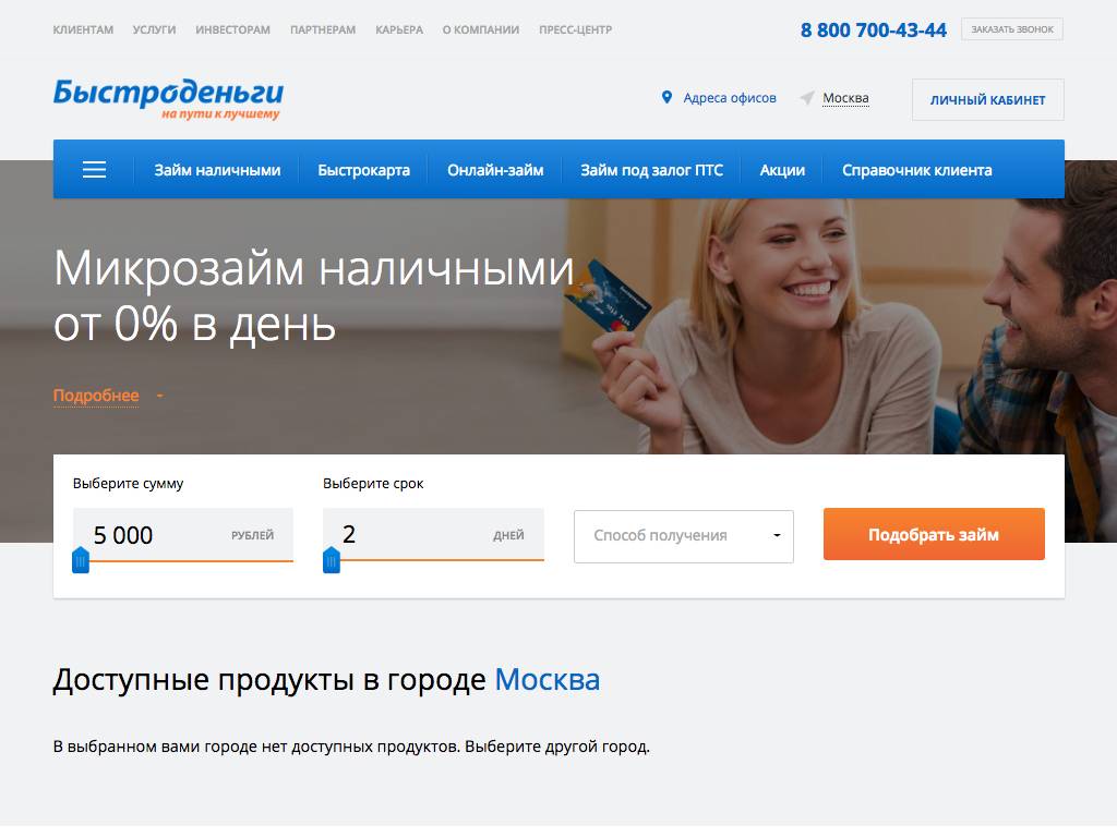 Быстроденьги — эта фирма специализируется на выдаче микрокредитов (до 50 тысяч рублей). Срок, в течение которого нужно вернуть средства, может варьироваться от 1 до 180 дней (все зависит от типа займа). Деньги выдают в офисах, перечисляют на карты. Средняя ставка — 2,2%. Для погашения используют банковские переводы, терминалы таких систем, как Comepay, Киберплат. Можно рассчитаться и в офисе. В перечне услуг компании есть также страхование, консультации юристов и медиков.