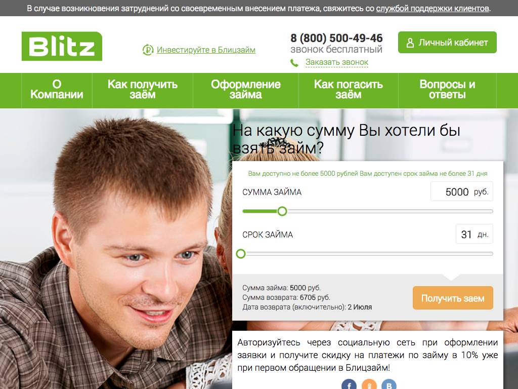 Blitz — это быстрые займы через интернет до 8 тысяч рублей (для тех, кто обращается первый раз). Постоянным заемщикам открывают доступ к кредитам до 50 тысяч рублей. Деньги перечисляют на именные карты. Период использования во многом зависит от выделенной суммы. Максимальный срок — 90 дней. Пролонгацию можно сделать только три раза. Сервис поддерживает больше десяти методов погашения, в том числе с помощью платежных карт и системы Яндекс.Деньги.