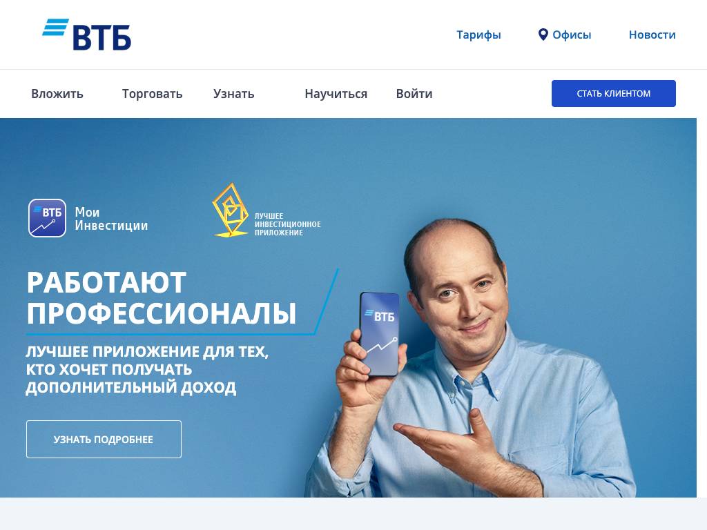 Брокер ВТБ — сервис брокерских услуг от ВТБ. С его помощью можно вложить средства в облигации, иностранные ценные бумаги. Всем клиентам доступна торговля на Московской и Санкт-Петербургской биржах. Пользователи со статусом квалифицированного инвестора имеют выход и на зарубежные площадки. Действует школа инвестора, в рамках которой проводятся курсы, игры и конференции. Работать можно как на компьютере, так и через мобильное приложение.