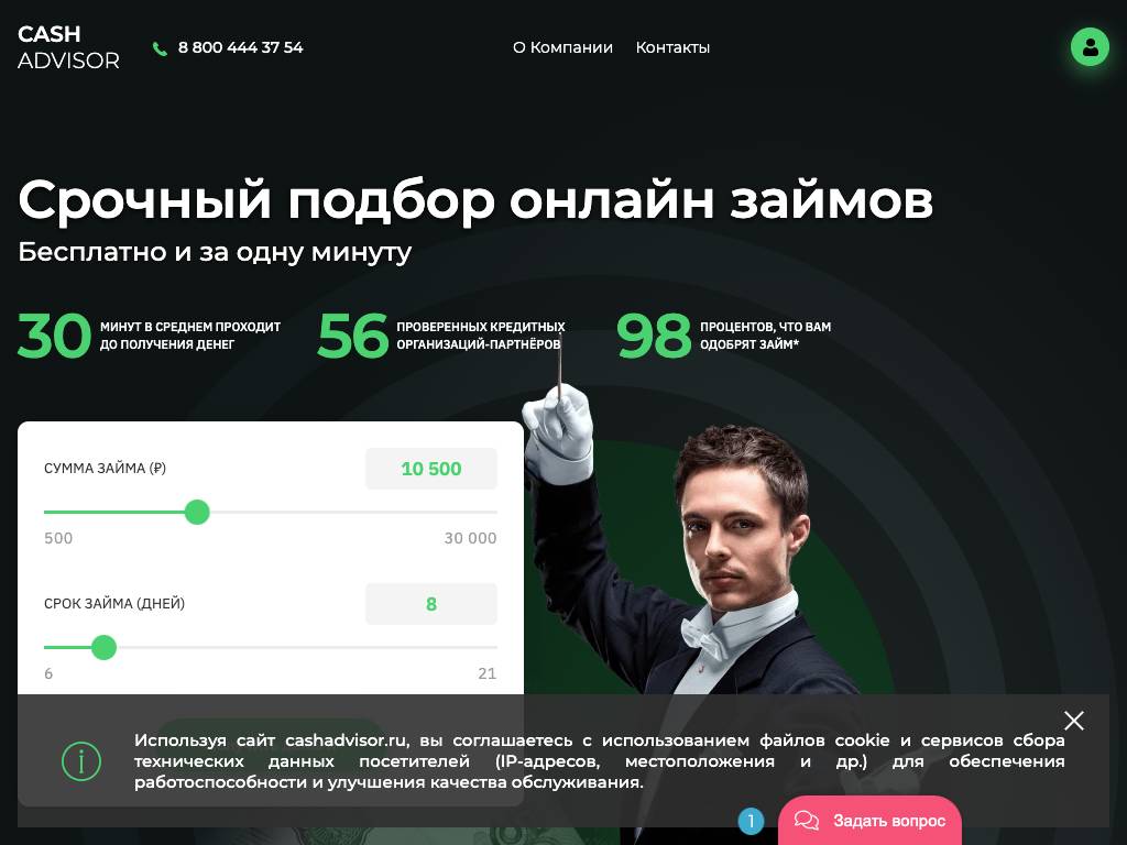 CashAdvisor — круглосуточный интернет-сервис по подбору займов. Новые клиенты могут получить сумму до 30 000 рублей на срок до 3 недель. Для подачи заявки необходимо ввести паспортные данные. Деньги будут перечислены на банковскую карту. Время ожидания обычно не превышает полчаса. Если при оформлении кредита или при его погашении возникнут вопросы, можно связаться с представителями компании по телефону, а также по электронной почте.