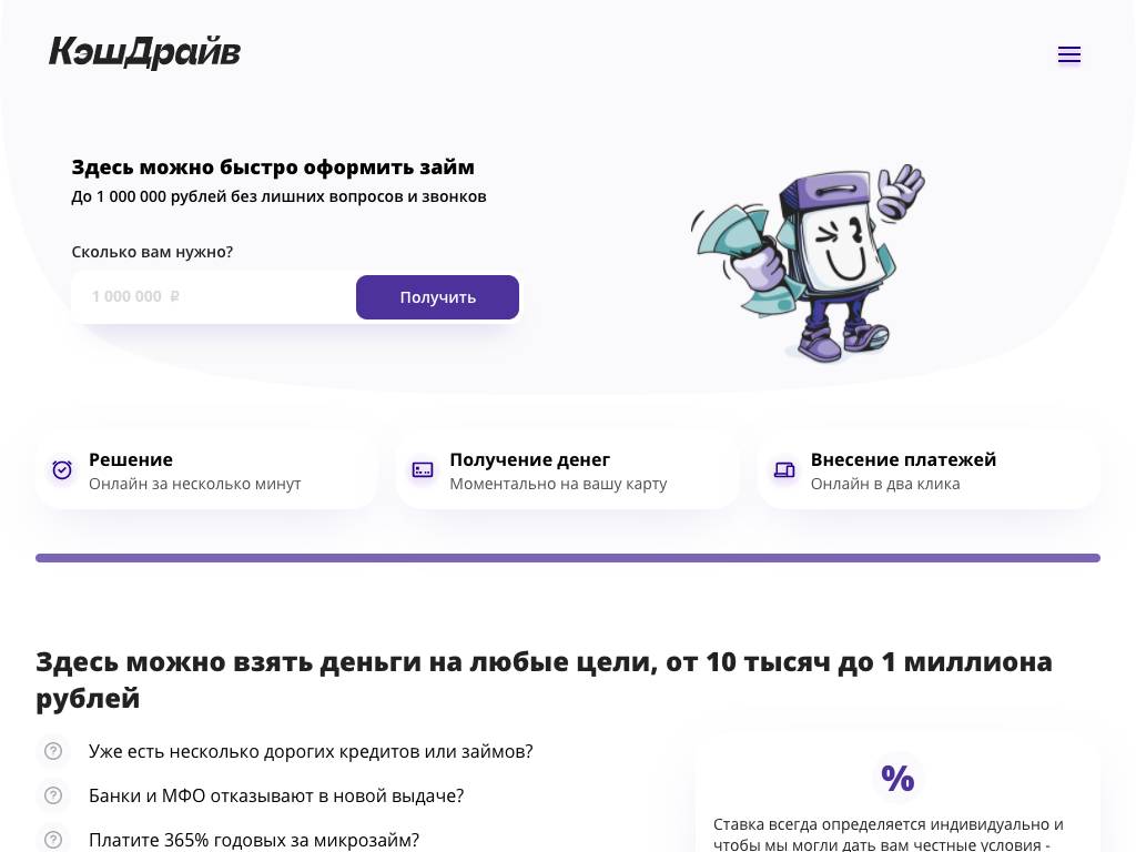 КэшДрайв — сервис по выдаче кредитов от 10 тысяч до 1 миллиона рублей. Клиентам доступны разные форматы займов, в том числе под залог автомобиля. Срок кредитования варьируется (6−60 месяцев). Ставка — от 12 до 365% годовых. Деньги перечисляют на карту. Погашение производится в личном кабинете, в любом банке по реквизитам, а также через сервис Золотая Корона. Связаться с менеджерами можно по телефону, по электронной почте, через мессенджеры WhatsApp, Viber или Telegram.