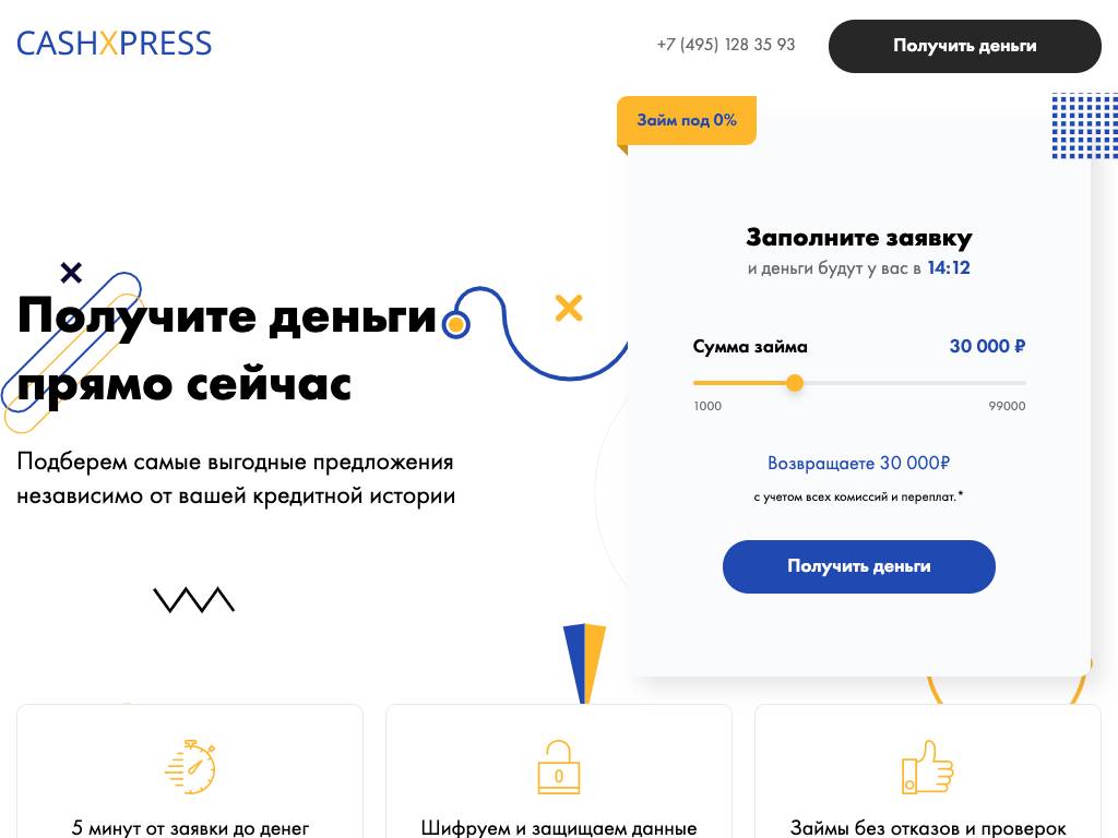 CashXPress — онлайн-сервис по подбору микрозаймов. Платформа работает круглосуточно без выходных. Заявки рассматриваются в течение нескольких минут. Для активации необходимо заполнить анкету, внести паспортные данные. Оплата в размере 499 рублей списывается с карты каждые пять дней пользования сервисом. Отмена подписки возможна в любой момент. Максимальный размер кредита — 99 тысяч рублей на срок до года. Связь с менеджерами: по телефону или по электронной почте.