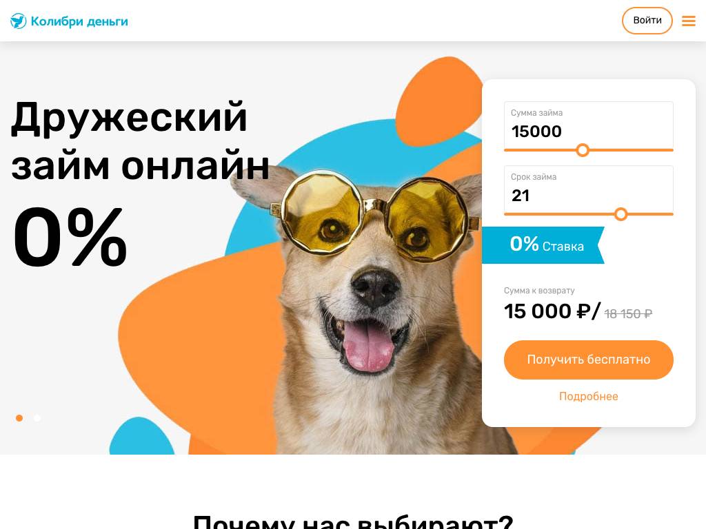 Колибри деньги — сервис по выдаче быстрых займов, работающий с 2011 года. Его клиенты могут получить от 2 тысяч до 35 тысяч рублей наличными или на банковскую карту. Заявки принимаются на сайте, по телефону и в офисах. Срок пользования кредитом не может превышать двух месяцев. Ставка — от 100% до 365% годовых. Погашают долг с банковской карты в личном кабинете, через системы QIWI и «Золотая Корона». Можно расплатиться наличными в ближайшем офисе компании. Работает многоканальный телефон для бесплатных звонков из регионов РФ.