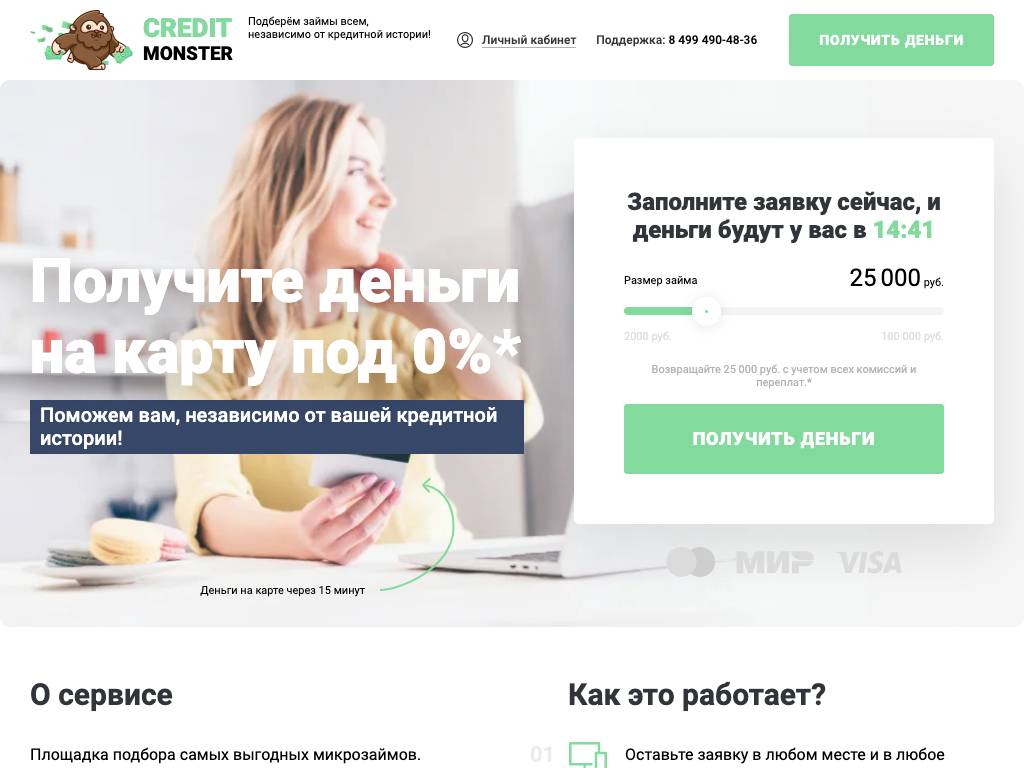 Credit Monster — онлайн-платформа для подбора займов от 2 тысяч до 100 тысяч рублей. При подаче заявки необходимо указать паспортные данные, номер телефона и адрес регистрации. После этого клиенту предоставляется список доступных предложений от различных кредитных организаций. Одобренная сумма может быть перечислена на карту в любое время суток. За каждые 5 дней пользования сервисом взимается комиссия до 499 рублей. С менеджерами можно связаться по телефону или электронной почте.