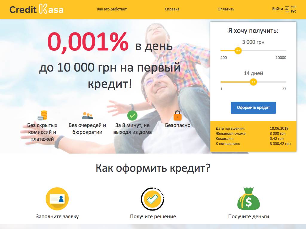 CreditKasa — украинская финансовая фирма, в которой можно получить кредит. Залог или поручители не требуются. Сумма займа от 400 до 10 000 гривен на срок до 4 недель. Постоянным клиентам могут выдаваться ссуды большего размера. Средства перечисляют на карту. Плата за пользование кредитом фиксированная — 2% в день. Однако если вы никогда ранее не получали займ в «УКР КРЕДИТ ФИНАНС», процентная ставка может быть снижена до 0, 01% в сутки.