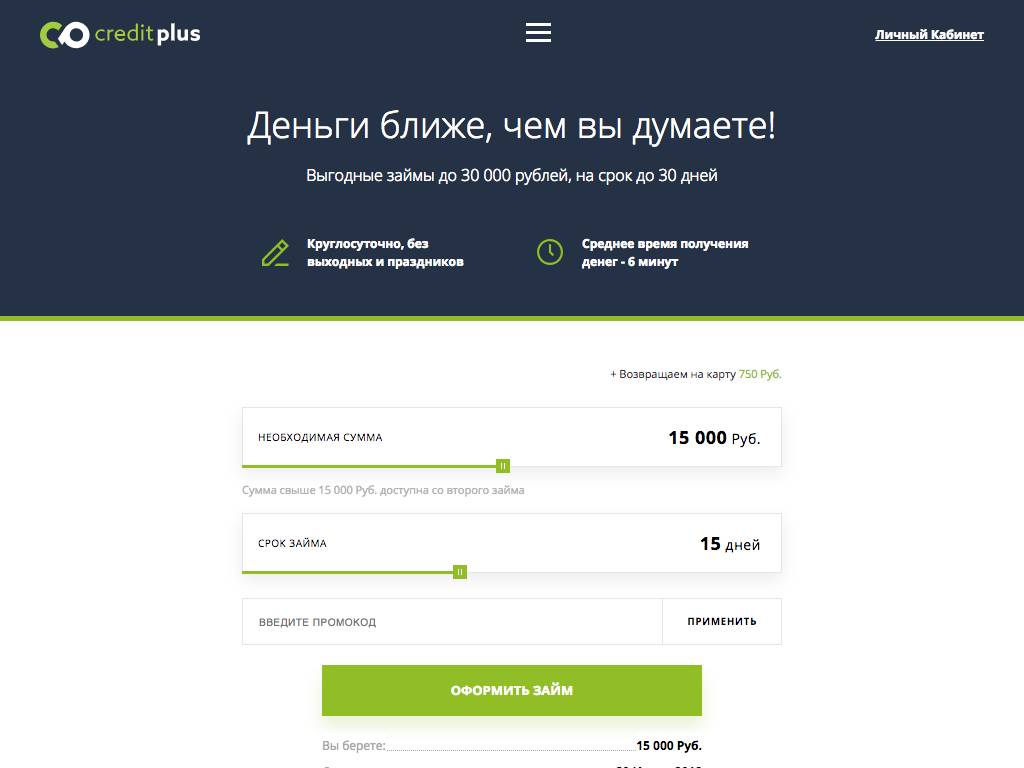 Creditplus — фирма, которая выдает займы до 50 тысяч рублей на карту, счет или через систему «Contact». Заявку можно оставить по телефону, а также заполнить на сайте. Клиент сам выбирает период пользования деньгами. Максимально допустимый срок — 24 недели. Величина ставки (до 1,95% в день) зависит от нескольких факторов, например, от полученной суммы. Средства возвращают через банкоматы «Почта Банка», терминалы QIWI и другими способами. Добросовестные заемщики имеют право на кэшбэк в размере 6%.