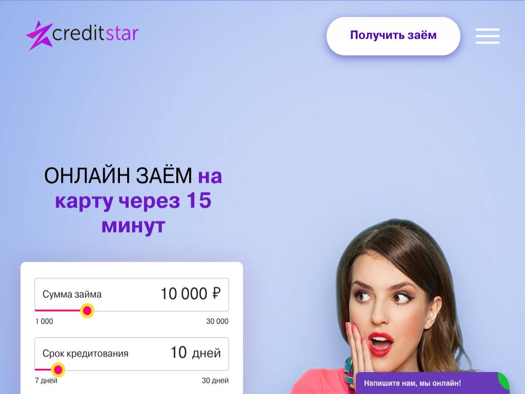 CreditStar — онлайн-служба выдачи займов на суммы до 30 тысяч рублей. Деньги переводят на карту в течение 15 минут. Срок возврата не превышает одного месяца. Ставка — 1% в сутки. Погасить долг можно, перечислив средства с банковской карты. Комиссия при этом не взимается. Компания планирует расширить список путей погашения. Скоро сервис будет принимать платежи через терминалы QIWI, Золотая Корона, CyberPlat.
