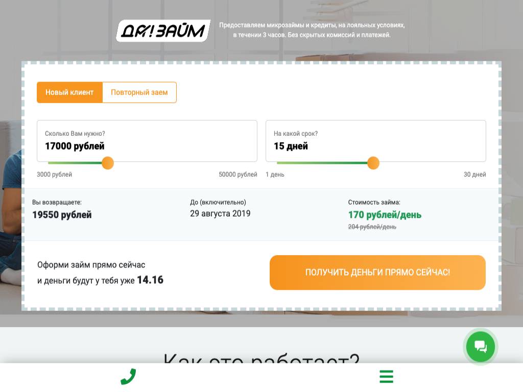 Да! Займ — организация, выдающая онлайн и оффлайн кредиты. Максимальный займ для новых клиентов — 50 000 рублей на срок до 31 дня. При повторных обращениях становятся доступными более крупные суммы. Ставка от 0,7 до 1% в сутки. Заявки принимаются на официальном сайте и в региональных представительствах фирмы. Деньги можно получить в офисе или на банковскую карту. Приемлемы разные способы погашения, например, через терминалы Элекснет, в салонах связи или с кошельков QIWI.
