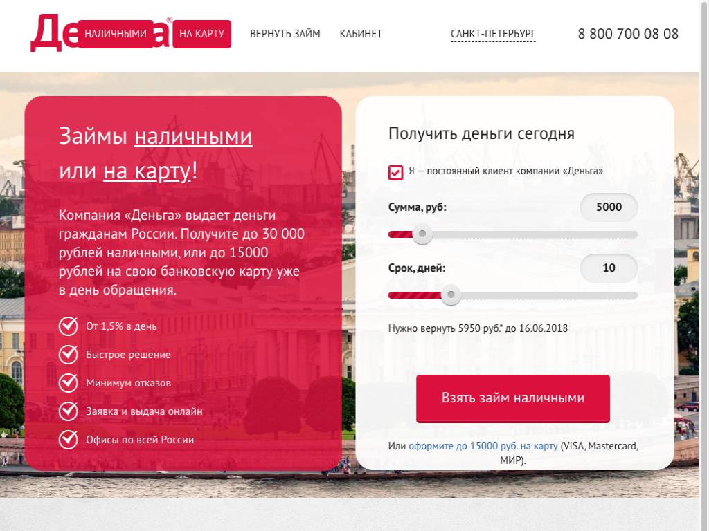 Деньга — займы в этой компании доступны жителям России. Их выдают не более чем на 28 дней. В некоторых регионах можно получить до миллиона с условием, что залогом станет ПТС. Сам автомобиль при этом остается у хозяина. Без залога доступно до 100 тысяч рублей. После одобрения выделенную сумму получают в офисе или на карту. Ставка — от 1,5% в день. Деньги для погашения переводят в пунктах Элекснет. Можно заплатить в офисе фирмы, в любом банке или с карты через сайт.