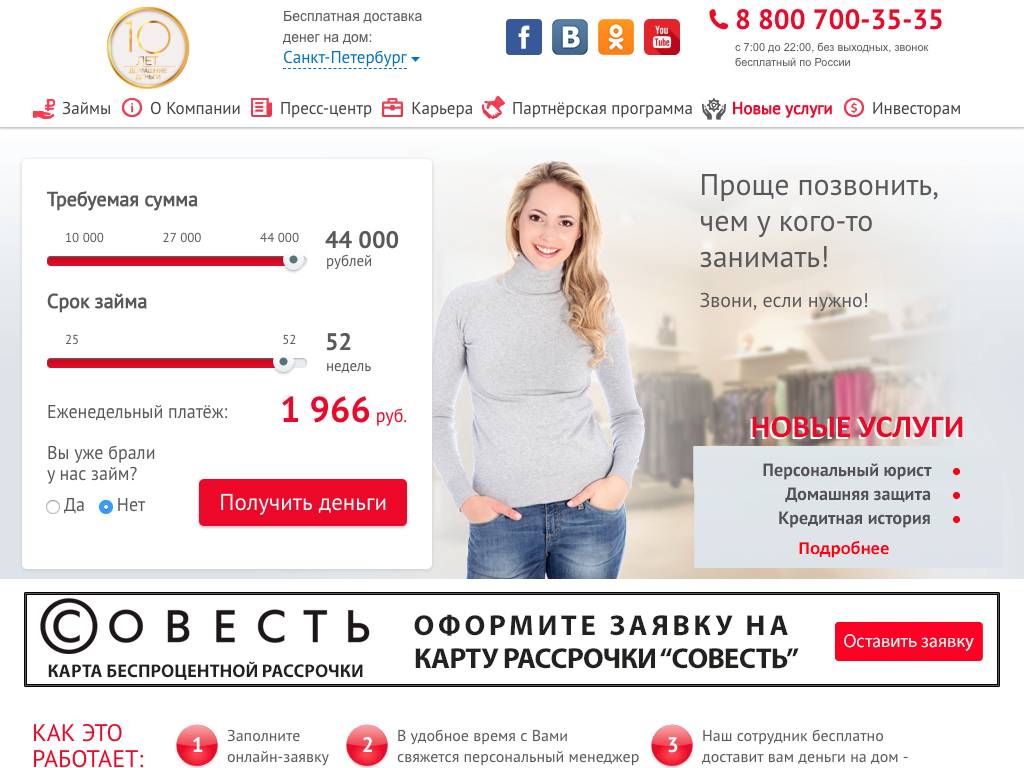 Домашние Деньги — компания, работающая в сфере микрофинансирования больше 10 лет. Чтобы получить от 10 тысяч до 50 тысяч рублей, необходимо оставить заявку на сайте или по телефону. После этого клиенту присылают персонального менеджера, который оформляет бумаги и выдает нужную сумму. Срок кредита: 25 недель или 52 недели. Погасить долг можно через Сбербанк-Онлайн, платежные терминалы QIWI, в салонах связи и другими способами. Полная стоимость займа в зависимости от продолжительности кредитования составляет от 180% до 250%.