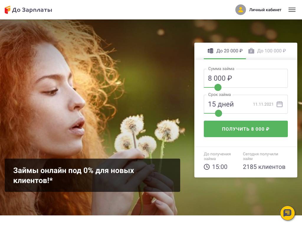 До Зарплаты — онлайн-сервис по выдаче займов. Компания работает с 2011 года. Максимальная сумма — 100 тысяч рублей. Срок кредитования не превышает 180 дней. Заявку можно подать не только через сайт, но и с помощью мобильного приложения. Если по каким-то причинам клиент не получает одобрения, заявку передают на рассмотрение партнерам. Погашение долга производится в личном кабинете с банковской карты, через систему ЮMoney или наличными в банкоматах Сбербанка. Вопросы можно задать в онлайн-чате или через специальную форму обратной связи на сайте.