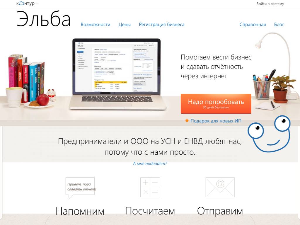 Эльба — удобное онлайн программное обеспечение, помогающее предпринимателям и организациям вести бухгалтерию. Взаимодействие осуществляется через браузер, действует система электронной подписи, круглосуточная поддержка и консультация бухгалтеров и юристов. Эльба всегда напомнит когда нужно заплатить зарплату, налоги, отчитаться в налоговую и подготовит для этого соответствующие документы.