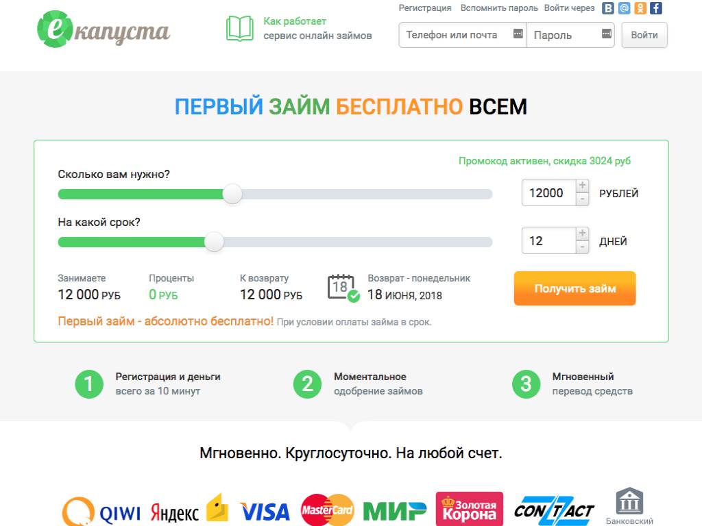 Е-капуста — в данной интернет-службе можно получить заем до 30 тысяч рублей. Первый кредит здесь выдают бесплатно. Возможны разные сроки возврата: от одной до трех недель. Компания гарантирует легкое оформление заявок, быстрое одобрение и перечисление средств. Деньги можно получить на платежную карту, на счет QIWI, через систему CONTACT и некоторыми другими способами. Погашение производится аналогичными методами. Ставка зависит от срока. Например, плата за пользование кредитом на 7−12 дней — 766.5% годовых (это 2,1% в сутки).