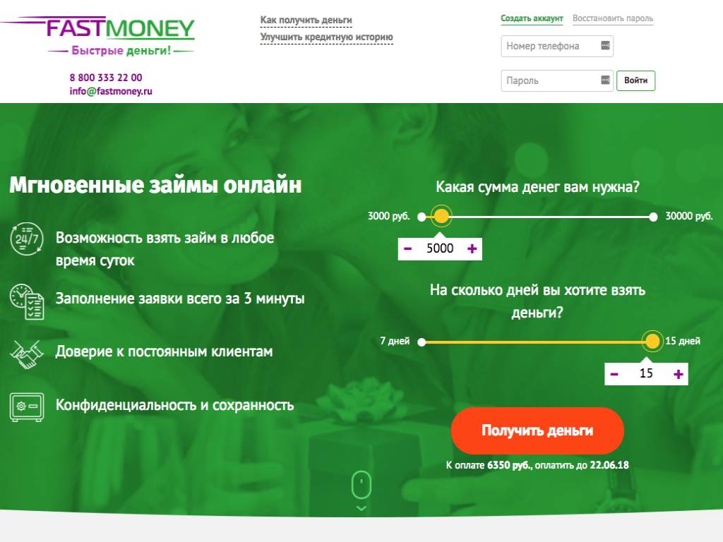 FastMoney — фирма, предоставляющая займы в короткие сроки. Рассмотрение заявки длится не более получаса. Одобренную сумму (от 1 тысячи до 35 тысяч рублей) выдают наличными в офисе или перечисляют на карту. Срок пользования кредитом — от 5 до 15 дней при ставке от 1,3% до 2% в сутки. Оплатить задолженность можно через терминал QIWI, картой онлайн, наличными в офисе. Есть и другие варианты расчета. Фирма также помогает улучшить кредитную историю.