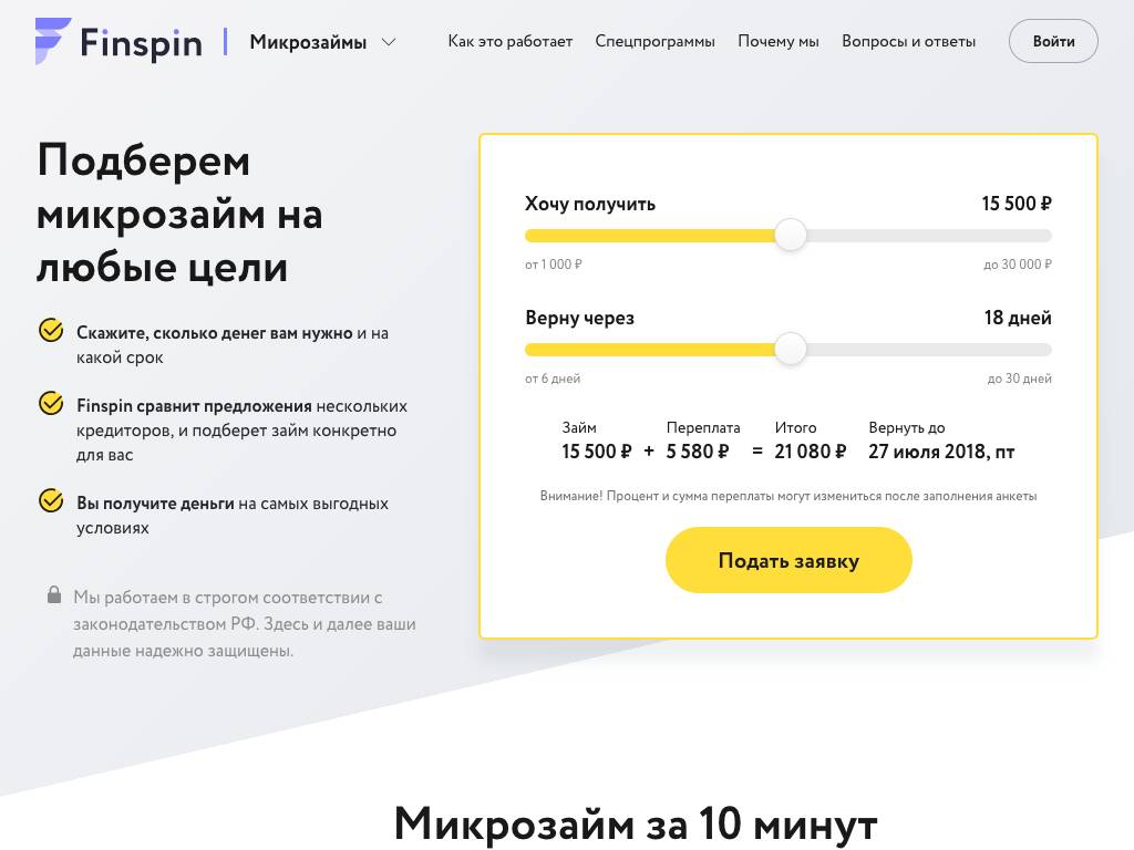 Finspin — сервис, оказывающий помощь в подборе микрозаймов, кредитов и кредитных карт. После того как клиент отправит анкетные данные, система выдает подходящие варианты от нескольких кредиторов. Максимальная сумма микрозайма равна 30 тысячам рублей (срок от 6 до 30 дней). Обычно деньги приходят на счет за нескольких минут. Лимит кредитной карты — от 30 тысяч до 1 миллиона рублей. Для подачи заявки нужен только паспорт.