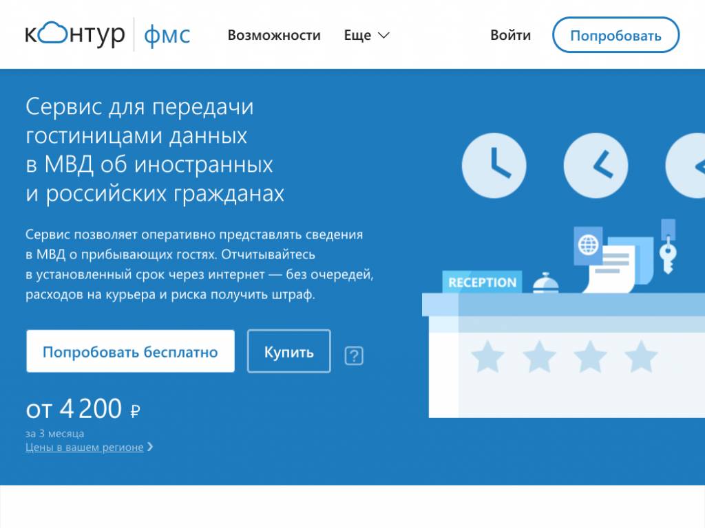 ФМС Контур — этот онлайн-сервис помогает быстро передать сведения об иностранцах из гостиниц в систему МВД. Подключиться к нему имеют право не только отели, но и медицинские организации. Познакомиться с работой системы можно бесплатно. На тестовое ознакомление после отправки заявки дают три дня. Затем за услугу нужно будет платить (от 4 200 рублей за три месяца). Принимается оплата картами. Программа создана компанией «СКБ Контур» (Россия).