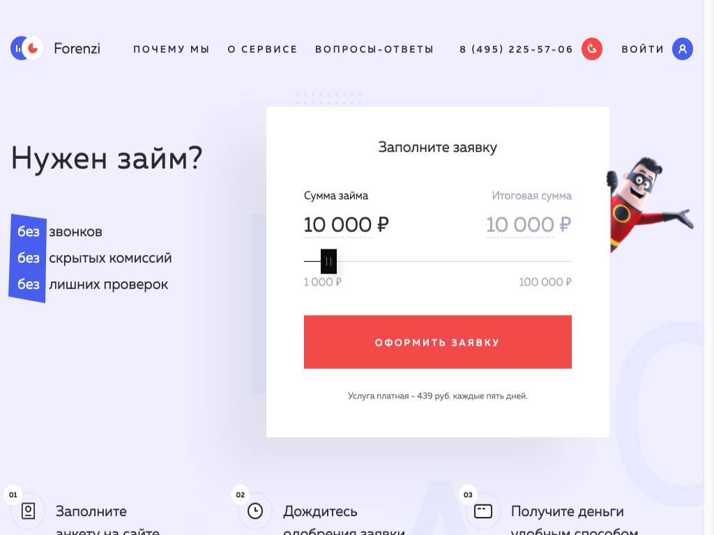 Forenzi — интернет-сервис по подбору займов до 100 тысяч рублей. За каждые пять дней использования списывается сумма в размере 439 рублей. В начале работы необходимо заполнить анкету. После этого на электронный адрес или на телефонный номер будут высланы инструкции по дальнейшему оформлению кредита. Деньги перечисляют на банковскую карту, на электронные кошельки. Отказаться от подписки на услуги сервиса можно в любой момент в личном кабинете.