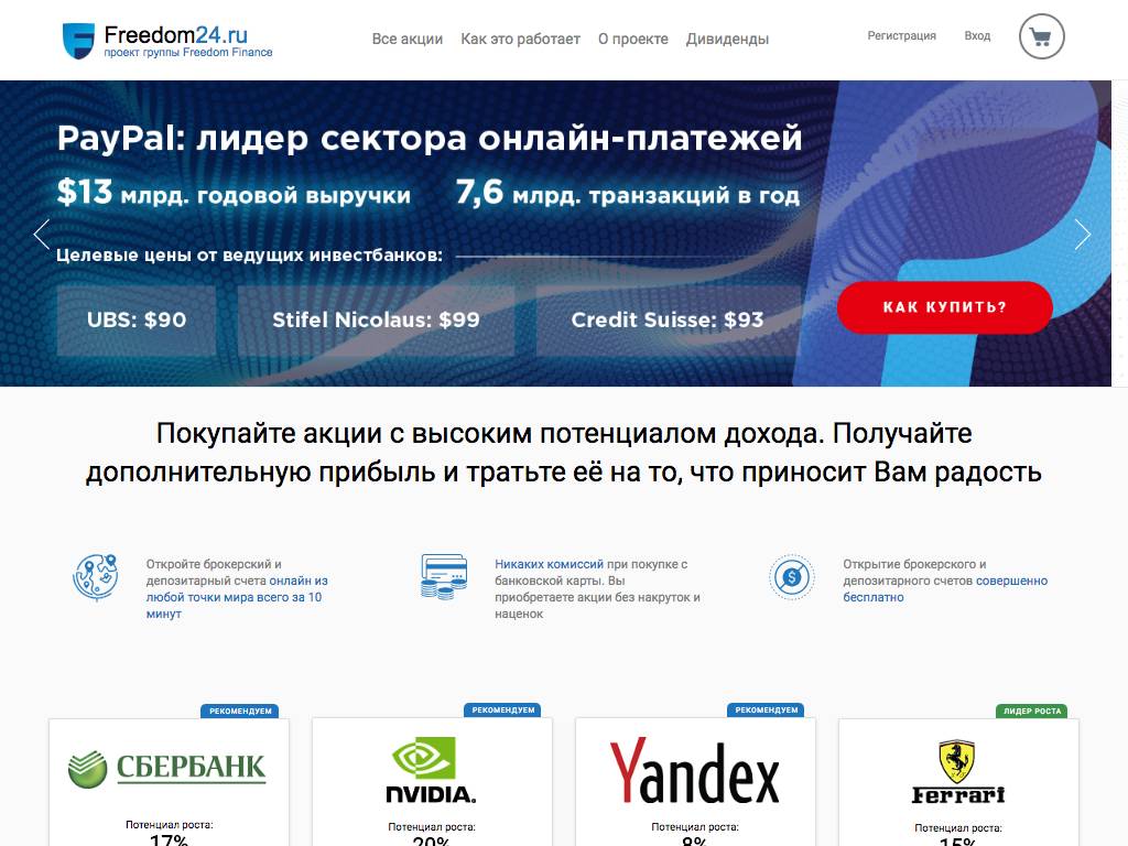 Freedom24.ru — онлайн-система, открывающая доступ к операциям с акциями. Завести брокерский счет здесь можно из любой страны мира. На регистрацию уйдет не больше 10 минут. На сайте представлены ценные бумаги десятков компаний, например, ГАЗПРОМ, Сбербанк. Оплатить купленный лот можно с банковской карты. Эксперты не рекомендуют держать в акциях больше 25% своих сбережений. Они предупреждают: заметной прибыли можно дождаться лишь при долгосрочном инвестировании.