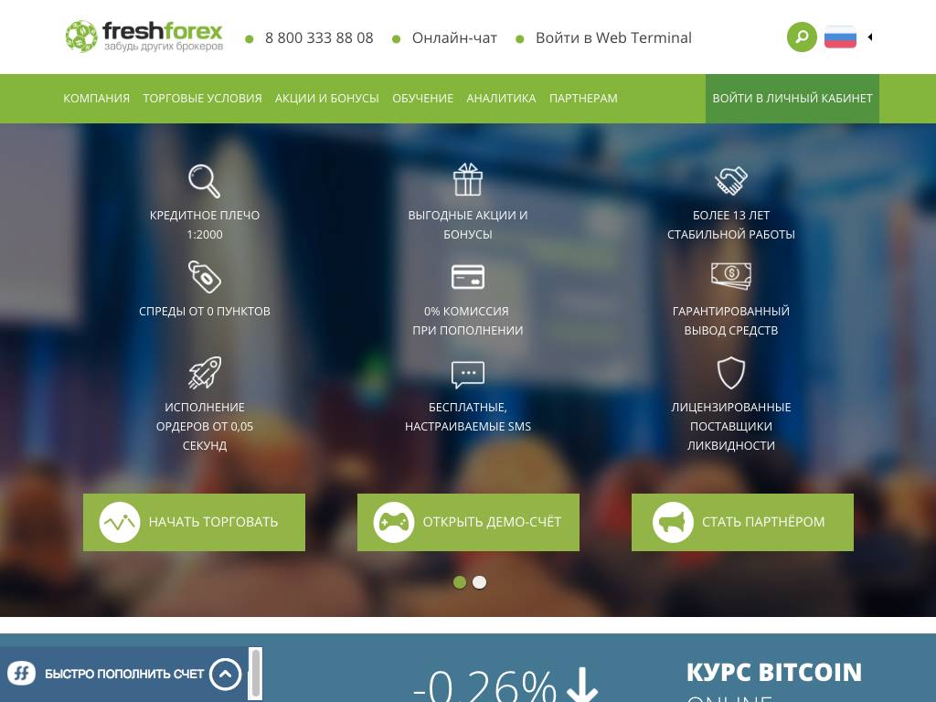 Freshforex — брокер Forex. Он дает возможность использовать при торговле акции, металлы и другие инструменты. Новички знакомятся с основами его работы с помощью демо-счета. Опытные трейдеры могут сразу заводить реальный счет. Депозиты пополняют через Яндекс. Деньги, с карт, мобильными платежами (всего больше 10 вариантов). Какой бы вы способ ни выбрали, комиссию брать не будут. Аналогичные схемы используют для вывода денег, во время которого всегда удерживают определенный процент.