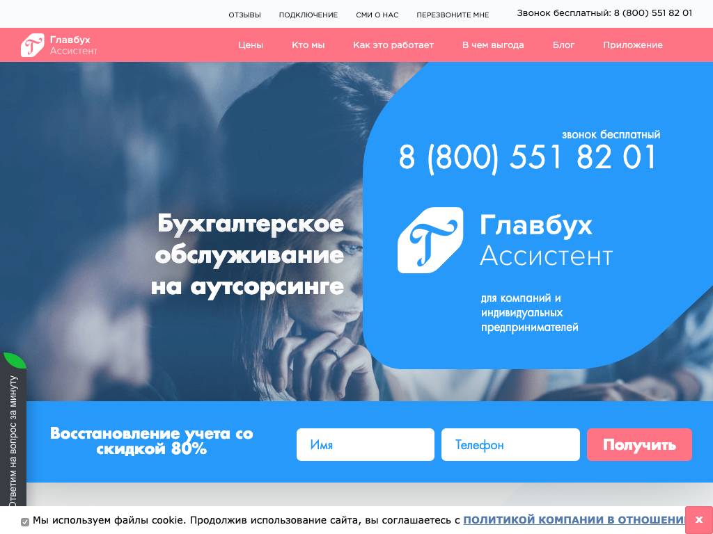 Главбух Ассистент — бизнес-сервис бухгалтерских услуг в режиме онлайн. Пакеты услуг включают ведение учёта, сдачу отчётности, начисление зарплат, ведение счетов, создание платёжек, проверку контрагентов и прочие бухгалтерские функции. Пользователь может работать через сайт, электронную почту или мобильное приложение. Информацию о действующих тарифах можно найти в разделе «Цены». Чтобы стать клиентом сервиса или получить бесплатный демо-доступ, достаточно оставить заявку на сайте, заполнив карточку обратной связи.