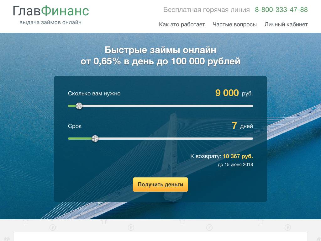 ГлавФинанс — сайт, на котором можно в считанные минуты оформить кредит. Если вы готовы подтвердить трудоустройство, то можете рассчитывать на займы от 3 000 до 100 000 рублей на срок от трех дней до 24 недель. Величина выплат зависит от многих факторов. Один из них — пользуетесь вы сервисом первый раз или постоянно? Деньги получают на карту или через сервис CONTACT. Ставка — от 0,65% в день. Рассчитаться с долгами можно через кошелек QIWI, с карты и другими методами.