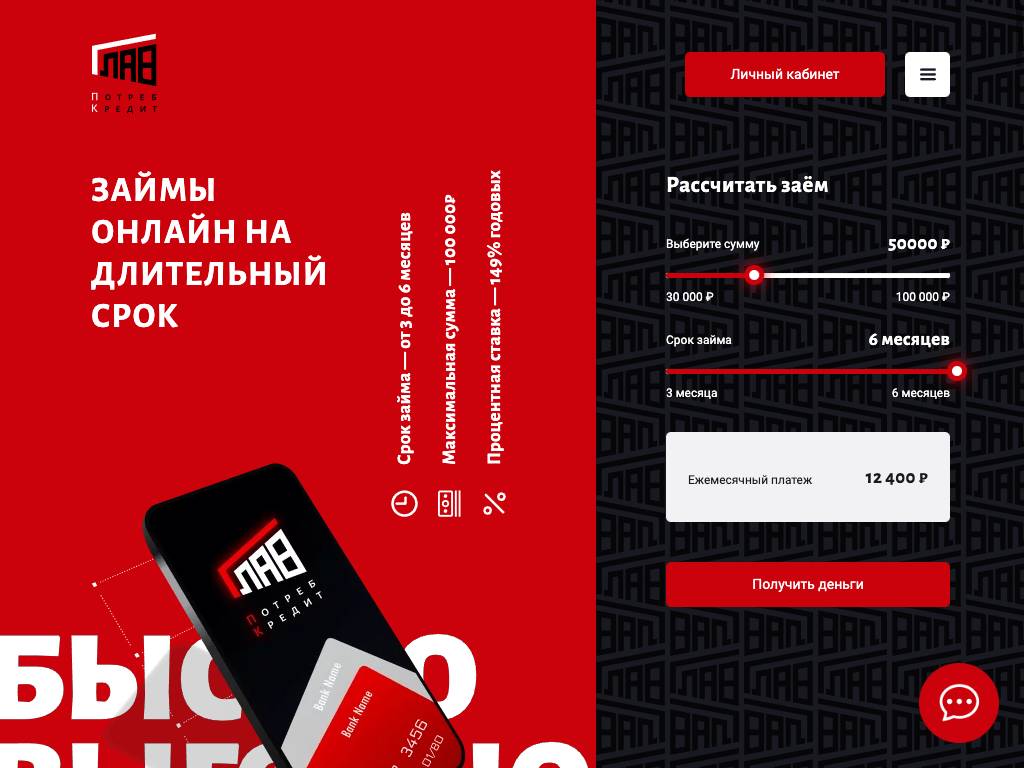 Главпотребкредит — онлайн-сервис по выдаче моментальных займов. Максимальная сумма кредита — 100 тысяч рублей. Деньги переводят на банковские карты. Ставка — 149% годовых. Погасить долг можно через систему «Сбербанк Онлайн», терминалы QIWI, а также некоторыми другими способами. Разработано мобильное приложение. У компании есть собственная пресс-служба и многоканальный телефон для бесплатных звонков из любой точки РФ.