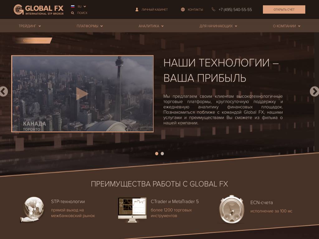 Global FX — брокер, помогающий торговать на рынке Forex. Его главный офис расположен в канадском городе Торонто. Есть представительства в других странах, в том числе в России. Функционирует телефонная линия для поддержки русских клиентов. Сайт дает доступ к трем платформам. Для зачисления денег (без комиссии), а также для вывода прибыли (с комиссией) используют платежные карты и систему Tether. Расчеты ведутся как в рублях, так и в долларах.