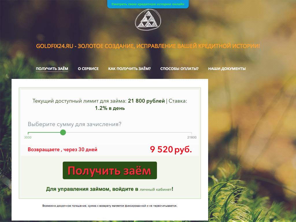GoldFix24 — это сервис, с помощью которого можно одновременно получить займ и поправить кредитную историю. При первом обращении доступно до 100 тысяч рублей. Если закроете кредит без задержек, лимит возрастет до 150 тысяч рублей. Ставка — 36,5% в год. Чтобы убрать задолженность, можно перечислить средства с банковской карты, из систем Яндекс. Деньги, WebMoney. Применяются и другие варианты расчетов, например, наличными.