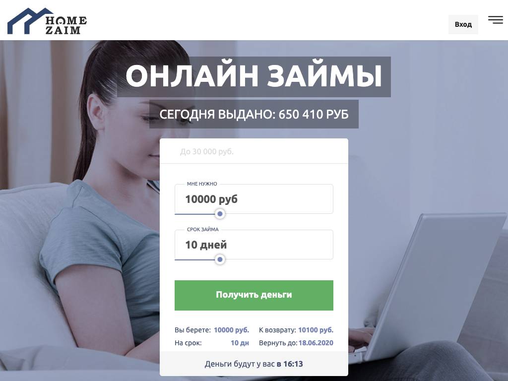 Home Zaim — интернет-сервис для подбора займов на сумму не более 30 тысяч рублей. Период кредитования — до 3 месяцев. Ставка — 1% в день. Деньги перечисляют на банковские карты и счета, на электронные кошельки. Возможна выдача наличных. За каждые 5 дней работы с сервисом списывается 449 рублей. Чем больше будет отправлено заявок, тем выше вероятность одобрения. Главный офис компании находится в Барнауле. Связаться с менеджерами можно по телефону или по электронной почте.