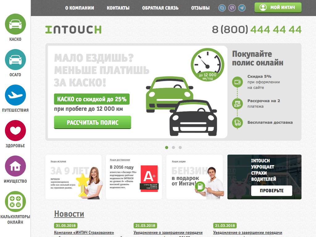 Intouch — страховые полисы данной компании можно заказать по телефону или через интернет. Помимо автопрограмм (КАСКО, ОСАГО), в продаже имеются продукты, защищающие жилье и туристов. Разработаны особые направления, например, гарантирующие выплаты при повреждениях на занятиях активным спортом. Оплатить полис можно прямо на сайте. Расчеты здесь ведутся с помощью карт, через систему WebMoney и другими способами.