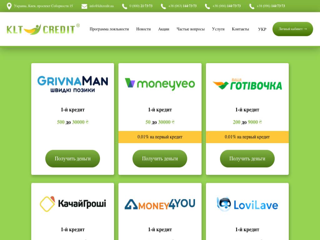 KLT Credit — украинский сервис онлайн-кредитования. Срок действия займов до 65 дней. Максимальная сумма — 10 тысяч гривен. Деньги приходят на банковскую карту. Минимальный набор документов для подачи заявки — паспорт и ИНН. Задолженность можно погасить средствами с карты в личном кабинете. Принимаются также платежи через терминалы, банковские переводы. Если пользователь приведет нового клиента, то получит бонус 100 гривен.