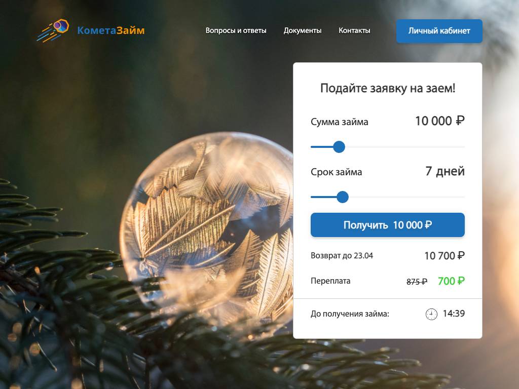 КометаЗайм — онлайн-сервис по выдаче кредитов до 50 тысяч рублей. Срок возврата не превышает 30 дней. Услуги предоставляет микрокредитная компания «Будьте богаты». Заявки обрабатываются круглосуточно в автоматическом режиме. Одобренную сумму перечисляют на карту. Ставка 50−365% годовых. Постоянные клиенты, погашающие задолженность вовремя, могут рассчитывать на снижение ставки. Обратная связь: по телефону, а также по электронной почте.