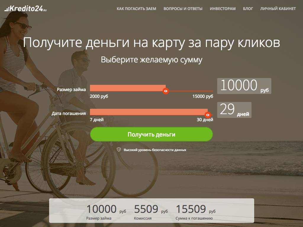 Kredito24 — эта компания выделяет с минимальными формальностями займы до 15 тысяч рублей. Если вы обращаетесь к ней впервые, ваш лимит — 9 тысяч. Рассмотрение заявки, оформление — все происходит в интернет-формате. Средства перечисляют на карту. Их нужно вернуть не позже, чем через месяц. Комиссия за кредит равна 1,9% в сутки. Для ликвидации долга можно перевести деньги через системы Элекснет, QIWI. Доступны и другие методы. Возможно продление на разные сроки за дополнительную плату.