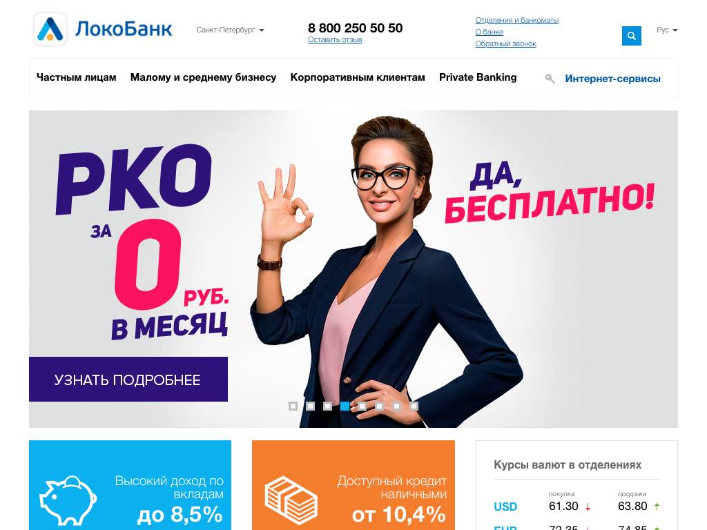 ЛокоБанк — коммерческий банк, оказывающий финансовые услуги частным лицам и представителям бизнеса. Основан в 1994 году. На сегодняшний день по активам и величине капитала входит в сотню ведущих банков России. На сайте банка можно получить информацию о вкладах, кредитах, счетах, картах, а также прочих продуктах и услугах банка. Для управления своими финансами клиенты банка могут пользоваться интернет-банком на сайте или специальным мобильным приложением. Также на сайте есть разделы с актуальными предложениями для бизнеса и корпоративных клиентов.