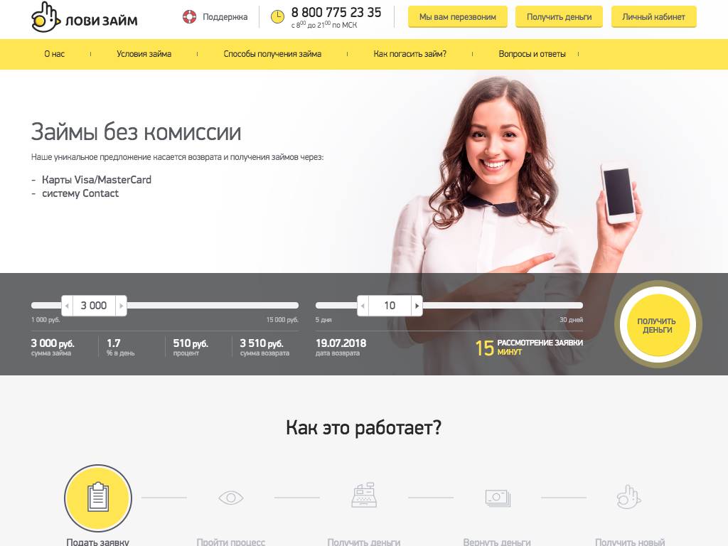 Лови Займ — фирма, в которой жители РФ могут получить небольшие кредиты. Клиентам-новичкам доступны суммы до 5 тысяч рублей, постоянные могут получить больше — до 15 тысяч рублей на срок до 30 дней при ставке 1,7% в сутки. Фирма не отказывает в займах студентам и пенсионерам. Здесь могут «простить» испорченную кредитную историю или вообще не проверять ее. Деньги приходят на карту либо зачисляются через систему «Contact». Аналогичными путями происходит погашение задолженности.