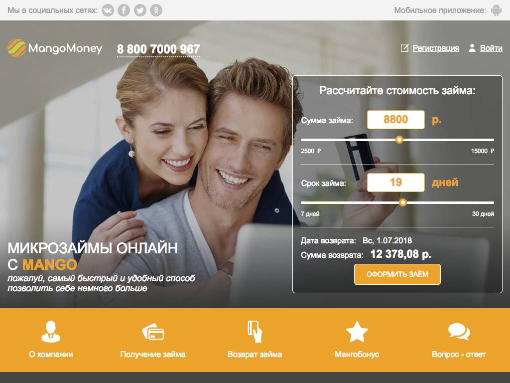 MangoMoney — данная служба быстро оформляет займы через интернет. Суммы до 20 тысяч рублей нужно вернуть в течение месяца. Можно запросить более крупный кредит (до 70 тысяч) продолжительностью до 24 недель. Расчеты (выдача денег или покрытие долгов) ведутся с помощью карт, переводов. Компания поддерживает платежи через QIWI. Действует несколько тарифных программ с разной ставкой (219% - 839,5% годовых). Для оформления нужны только паспорт и именная платежная карта.
