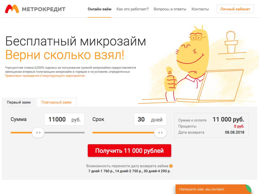 Метрокредит — онлайн-сервис, предоставляющий микрозаймы гражданам с постоянной российской регистрацией. Сервис позволяет оформить заём от 1 до 30 тысяч рублей, сроком на неделю, две или месяц. Ставка по первому микрозайму составляет 0%, при последующих от 547,5% до 730% в год. Чтобы получить кредит, достаточно оставить заявку на сайте, а после её одобрения оформить договор. Заёмные средства сервис переводит на карту. Вернуть деньги можно с помощью банковской карты (в личном кабинете, по телефону или обратившись в чат), а также через сервисы ПАО Сбербанк.