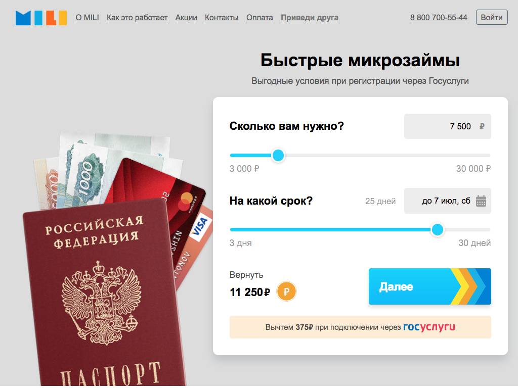 Mili — онлайн-сервис, предоставляющий срочные микрозаймы. Компания предлагает займы от 3 до 30 тысяч рублей. Срок погашения может составлять от 3 до 30 дней, а процентная ставка от 1,5% до 2% в день (может изменяться в зависимости от акций или индивидуальных условий). Для получения займа достаточно оставить на сайте заявку и дождаться решения Mili по заявке. Деньги перечисляются на банковскую карту через несколько минут после одобрения. Погасить микрозайм можно в личном кабинете при помощи карты, через терминал или кошелёк QIWI, а также наличными в салоне «Евросеть».