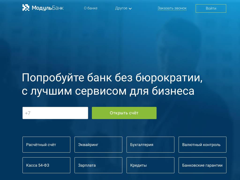 МодульБанк — цифровой банк для малого бизнеса, полностью работающий в режиме онлайн. Чтобы открыть расчётный счёт или воспользоваться расчётно-кассовым обслуживанием достаточно оставить на сайте заявку с контактными данными. Для управления финансовыми операциями клиентам доступен интернет-банк. Также МодульБанк предлагает услуги кредитования, ведения бухгалтерии, услуги юриста, зарплатные проекты и прочие услуги для бизнеса, подробно описанные на сайте.