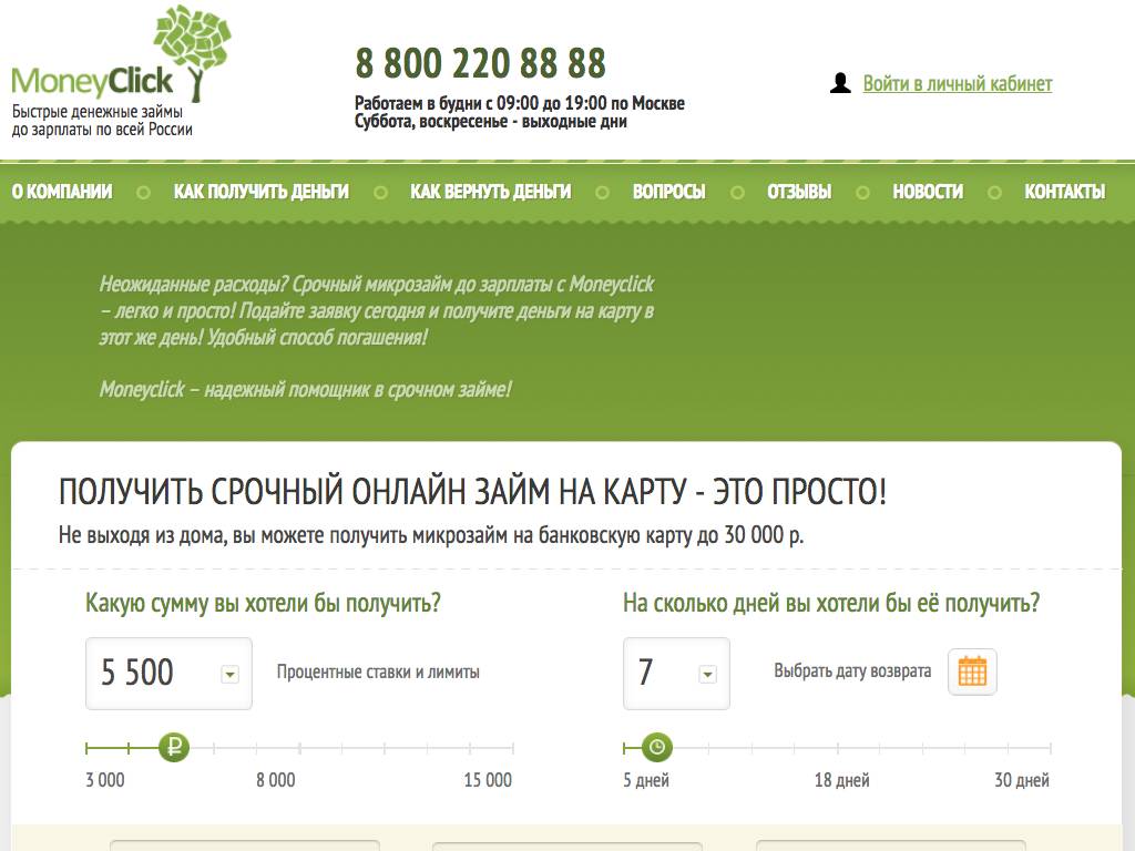 MoneyClick — онлайн-служба, перечисляющая микрокредиты на карту или ваш счет в банке. Размер займа для новых клиентов — до 8 тысяч рублей при ставке 2,1% в день. Если вы выплатите его без задержек, при последующих обращениях величина ссуды будет возрастать. Максимальная сумма, которую могут выдать, 30 тысяч рублей. При этом ставка за пользование снижается до 1,1% в сутки. Заявки принимают только через интернет. Погасить долг можно с банковской карты, по квитанции через банк, с помощью систем Яндекс. Деньги или QIWI.